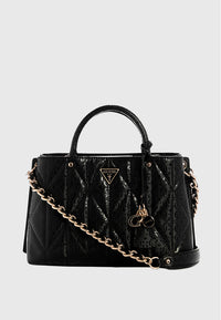 Double top handle Chain strap Magnetic clasp fastening Two internal zip pockets Compartments External zip pocket Guess logo triangle detail 100% Polyurethane