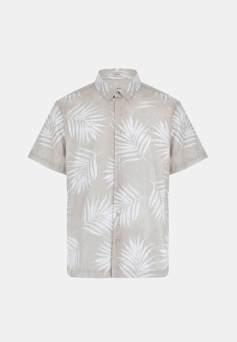 This shirt will take you to marvelous places. Featuring an allover abstract palm print, collar and button-up closures.