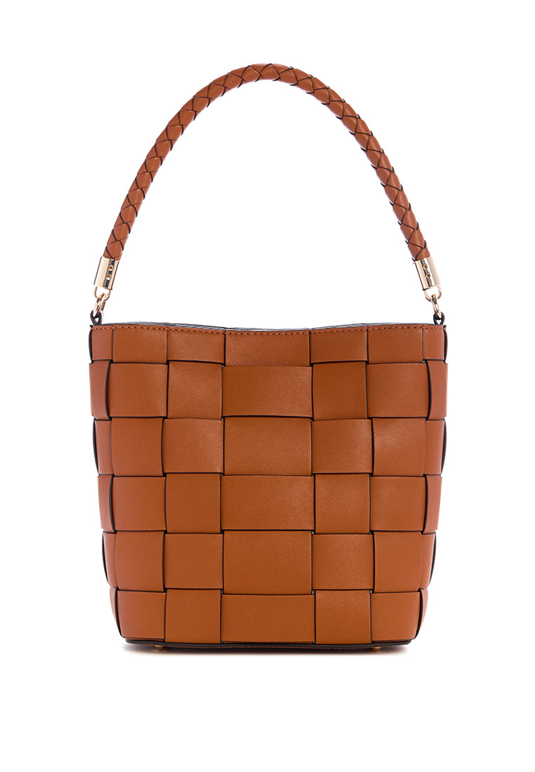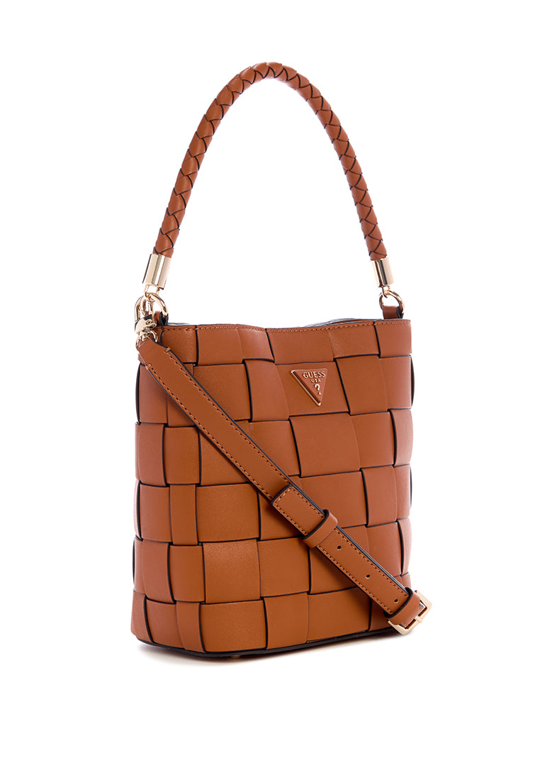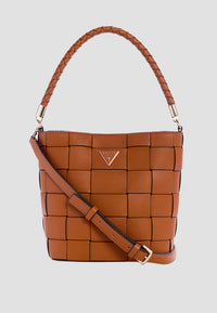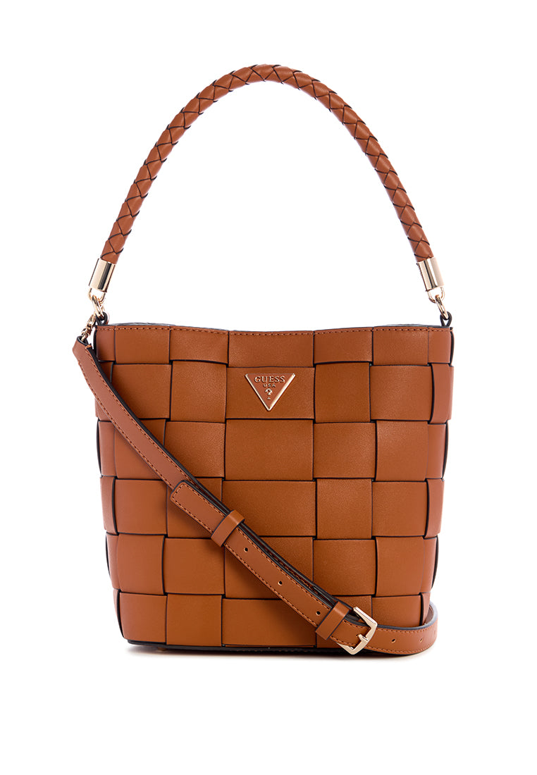Rolled top handle with 7" drop. Detachable crossbody strap with 22" drop.