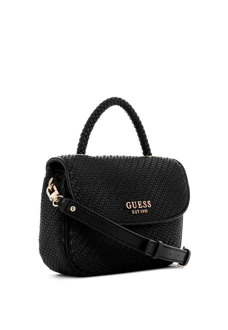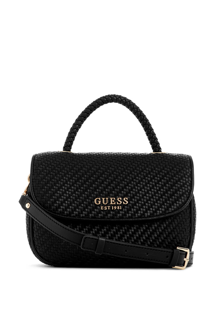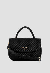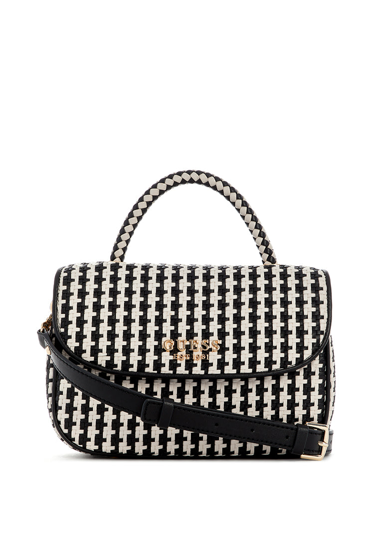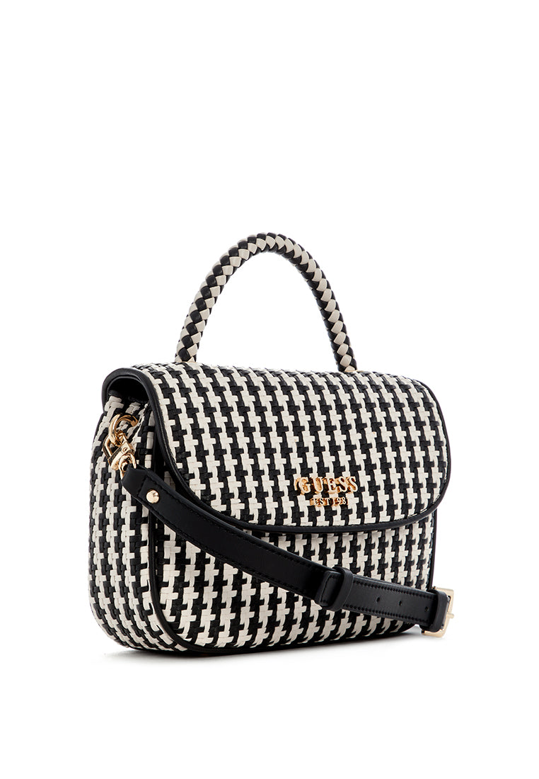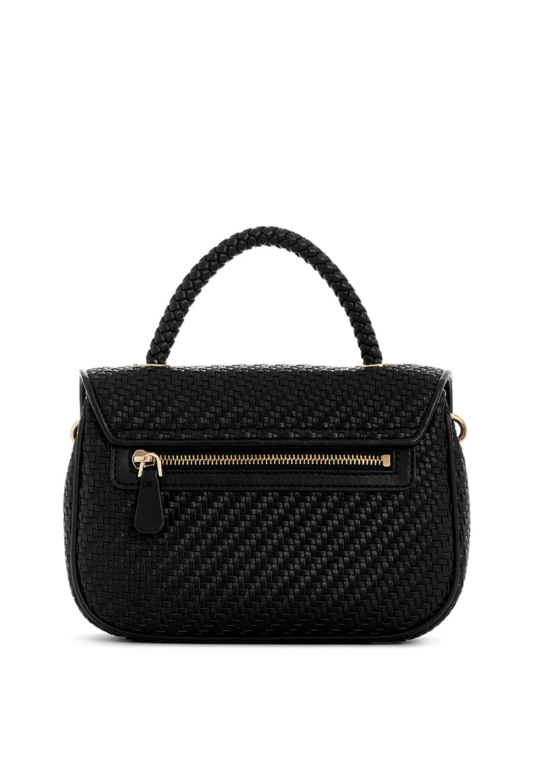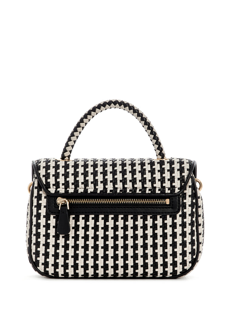 Woven faux-leather flap bag Shiny gold-tone hardware Flap closure with structured top handle Single-compartment construction Interior pocketing Top handle with 2.5" drop. Detachable crossbody strap with 22" drop. 9.25"W x 6.75"H x 2.25"D