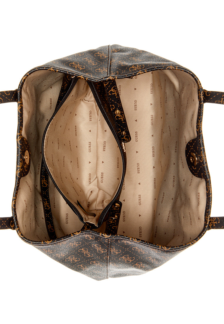 Get double the style with our light brown Vikky 2-in-1 logo tote bag. This versatile tote features two shoulder straps and a removable pocket for added convenience. With a PU-based peony logo and shiny gold accents, this bag is sure to turn heads. It's also the perfect accessory for any look.